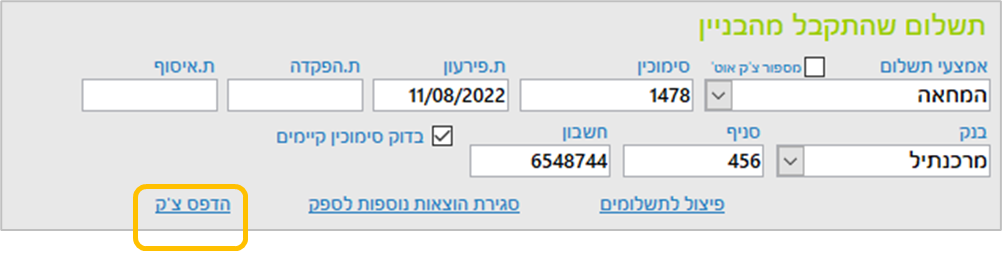 בפעולה הכספית נזין אמצעי תשלום המחאה ולאחר מכן המערכת תזין באופן אוטומטי את מספר הסימוכין (מספר הצ'ק), ופרטי חשבון הבנק של הבניין בהתאם למספר הצ'ק הקודם שהוזן בפעולה כספית אחרת.