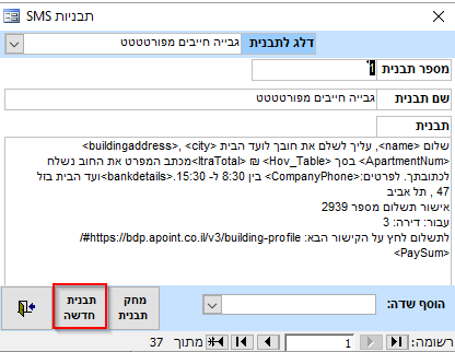 - מלל דינמי, שיהיה תחת מרכאות משולשים "<>". זהו מלל שישתנו בהתאם לנושא שבחרנו. למשל אם מדובר ב<name> אז זה אומר שכל דייר יקבל בהודעה, את השם שלו. לדוג': "שלום רפי", או "שלום יסמין"